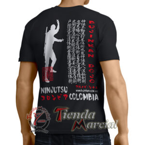 Esta camiseta está elaborada en tela de 100% algodón, cuello elástico redondo y estampada por la parte frontal con el ideograma japonés (Kanji) NIN, que traduce RESISTENCIA. Seguidamente están los kanji de BUJINKAN DÔJÔ y debajo en blanco dice NINJUTSU.