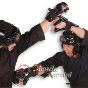 Se ajusta a la cabeza por medio de una tira elástica provista de velcro (cierre mágico). Este casco ofrece la máxima protección en entrenamientos de combate y campeonatos.