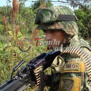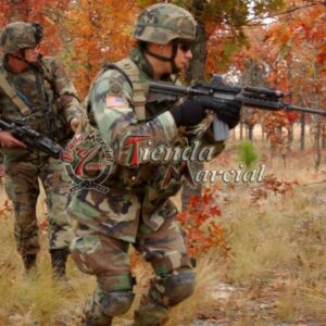 Forro camuflado woodland camo para cascos de combate tipo militar. Se ajusta al casco por medio de cintas con velcro que se encuentran en la parte inferior del forro. Puede hacerse una terminación en cuerda tipo malla para hacer un ajuste más preciso.