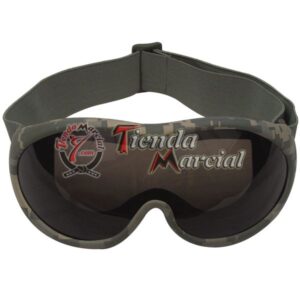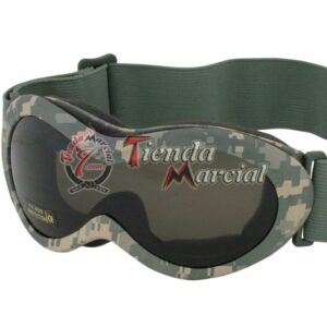 Gafas Militares protectoras con marco en acabado ACU Digital ultra ligero en termoplástico y poliuretano resistente, con espuma de encuadre de refuerzo acolchado para el mejor ajuste y comodidad. Lentes en policarbonato en humo gris con recubrimiento anti-arañazos y resistente a la niebla, con filtro de protección UV 400 para evitar los daños que produce los rayos del sol.