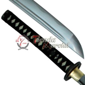 - Empuñadura (Tsuka) de madera con imitación de piel de raya y cuerda negra de algodón (Ito) envuelta.