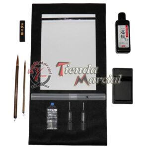Igual contiene un tarro de tapa azul para el transporte de la tinta o del agua para preparación del sumi.
