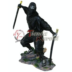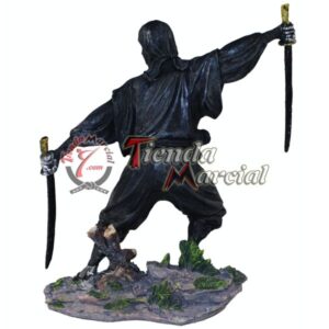 Hermosa figura elaborada en resina resistente. Es un Ninja con una espada empuñada en cada mano.