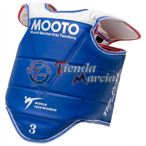 Esta pechera ofrece una cobertura completa del pecho y los costados, absorbiendo eficazmente los impactos durante el combate. Incorpora tiras de ajuste en la parte posterior, lo que garantiza una sujeción firme, estable y cómoda, adaptándose perfectamente al cuerpo del practicante sin limitar la movilidad.