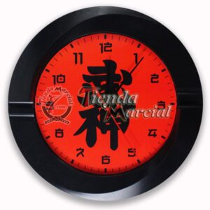 Hermoso reloj de pared redondo con relieve en pasta con los Kanji (idioma japonés) de BUJIN «Dios de la guerra». Tiene indicador horario, minutero y segundero. Su motor funciona con una batería AA (batería no incluida).