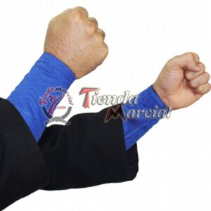 Estos tekkô (PAR) están elaborados en 100% algodón con material doble para una mayor protección de la muñeca y antebrazos. Tiene una cara en color negro y el reverso en color azul con cierre en velcro (cierre mágico).